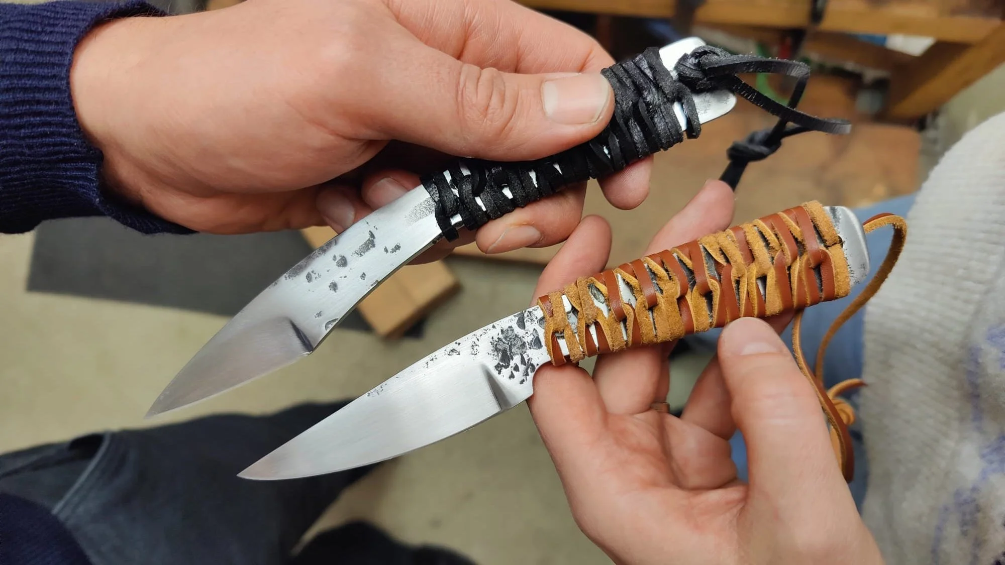 Werkstück: Ein Messer pro Person, mit einer Griffwicklung aus Leder im japanischen Knotenstil (siehe Bild oben)